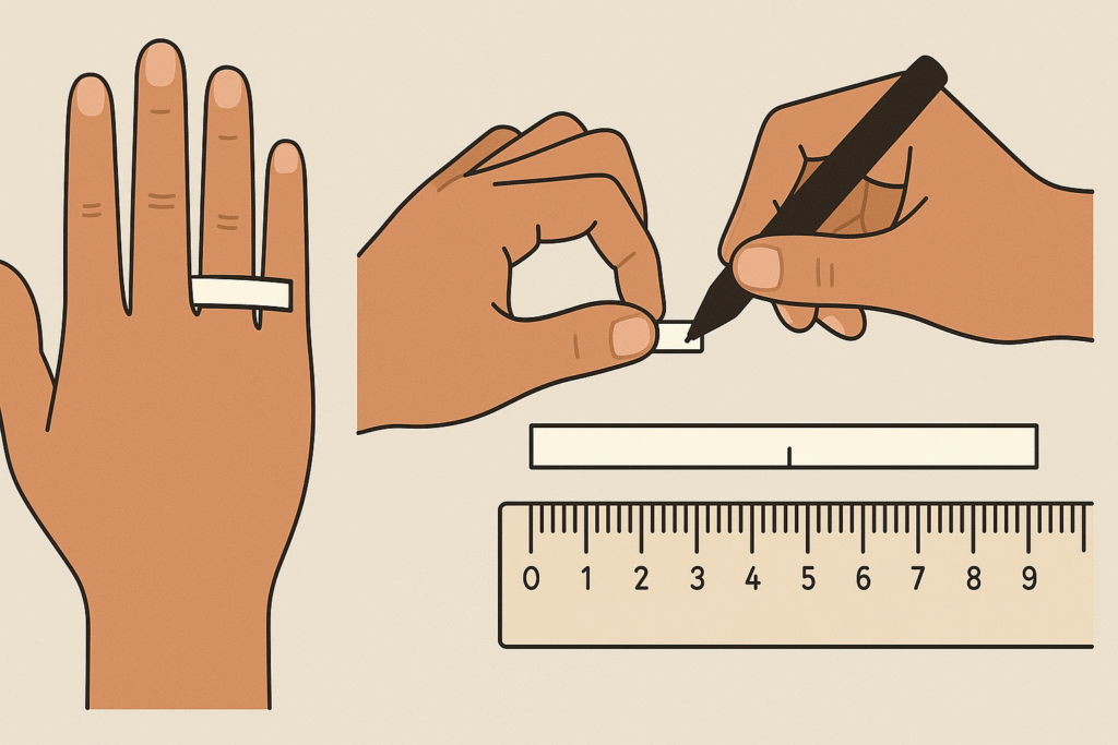 - Wrap it around the base of your finger—where the ring will sit. Don’t make it too tight; it should slide over the knuckle without resistance.
